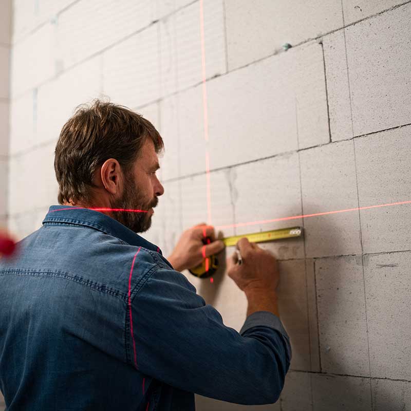 Handwerker, der auf der Baustelle arbeitet und die Wand misst
